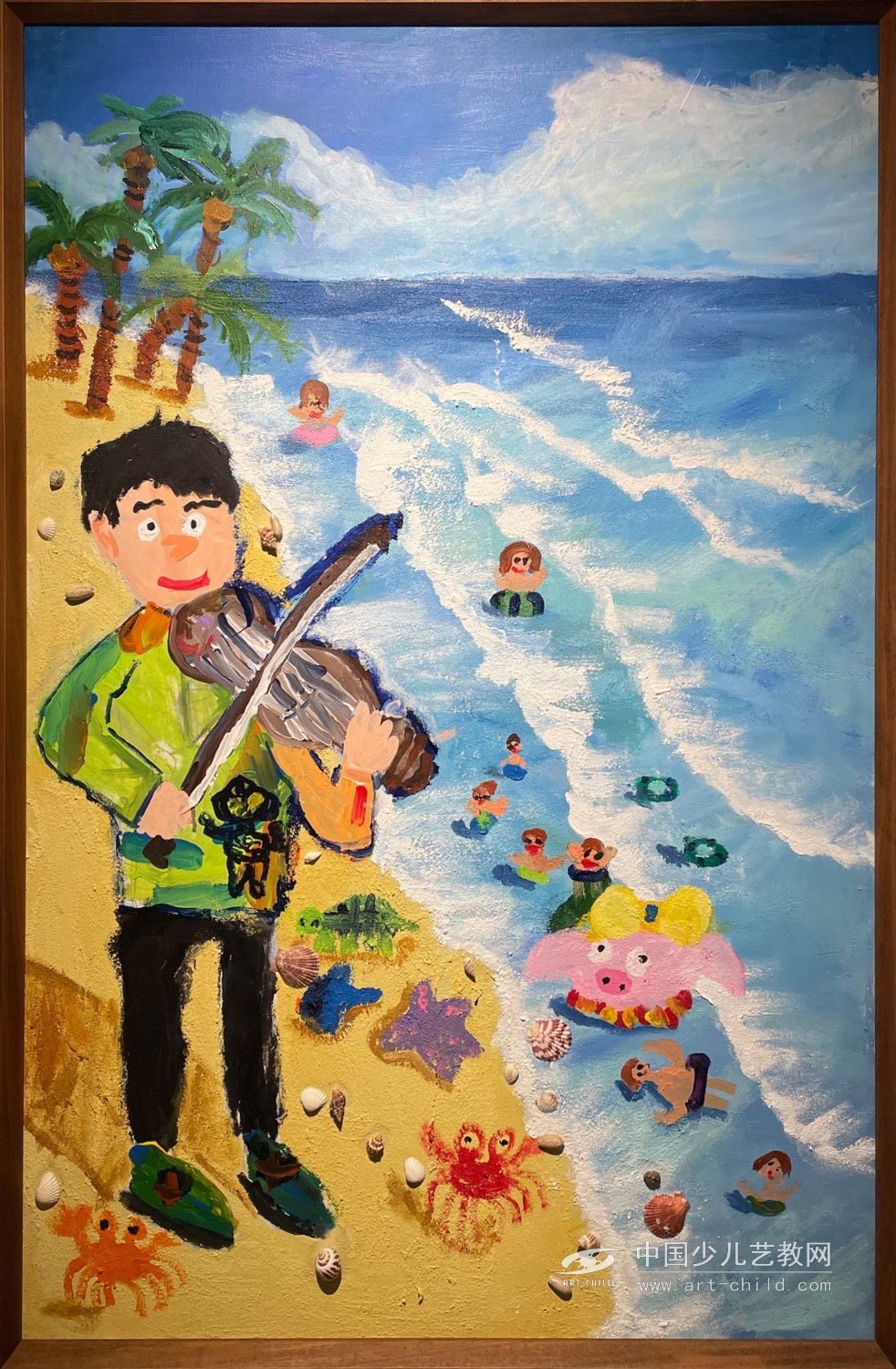 在《少儿画苑》国际少儿书画大赛中,7岁小画家刘逸涵创作的丙烯画《夏日海滨演奏会》以其清新童趣与艺术表现力脱颖而出。作品描绘一位男孩在金色沙滩上拉奏小提琴,海浪轻拍、椰影摇曳,螃蟹、海星与卡通泳圈点缀其间,仿佛整片海岸都在聆听这场即兴音乐会。画面将音乐、自然与游戏巧妙融合,展现出孩子对“艺术融入生活”的纯真理解。