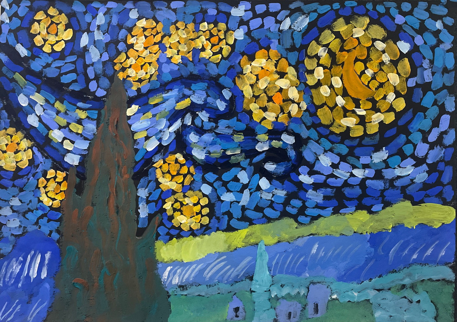 这幅 8 岁男童创作的《星月夜》,以梵高同名经典为参照,展现出超出年龄的艺术感知力与表现力。从技法层面看,小作者准确捕捉了原作的核心形式语言:以浓艳的钴蓝、群青构建夜空基底,明黄与白色的点状笔触模拟星光的闪烁,形成强烈的冷暖色彩对冲,既还原了后印象派的色彩张力,又通过短促的点画技法传递出星空的动感。画面中螺旋状的笔触排布虽稚拙,却已具备引导视觉流动的意识,尤其星云部分的曲线组合,隐约呼应了原作 “情感漩涡” 的意象表达。