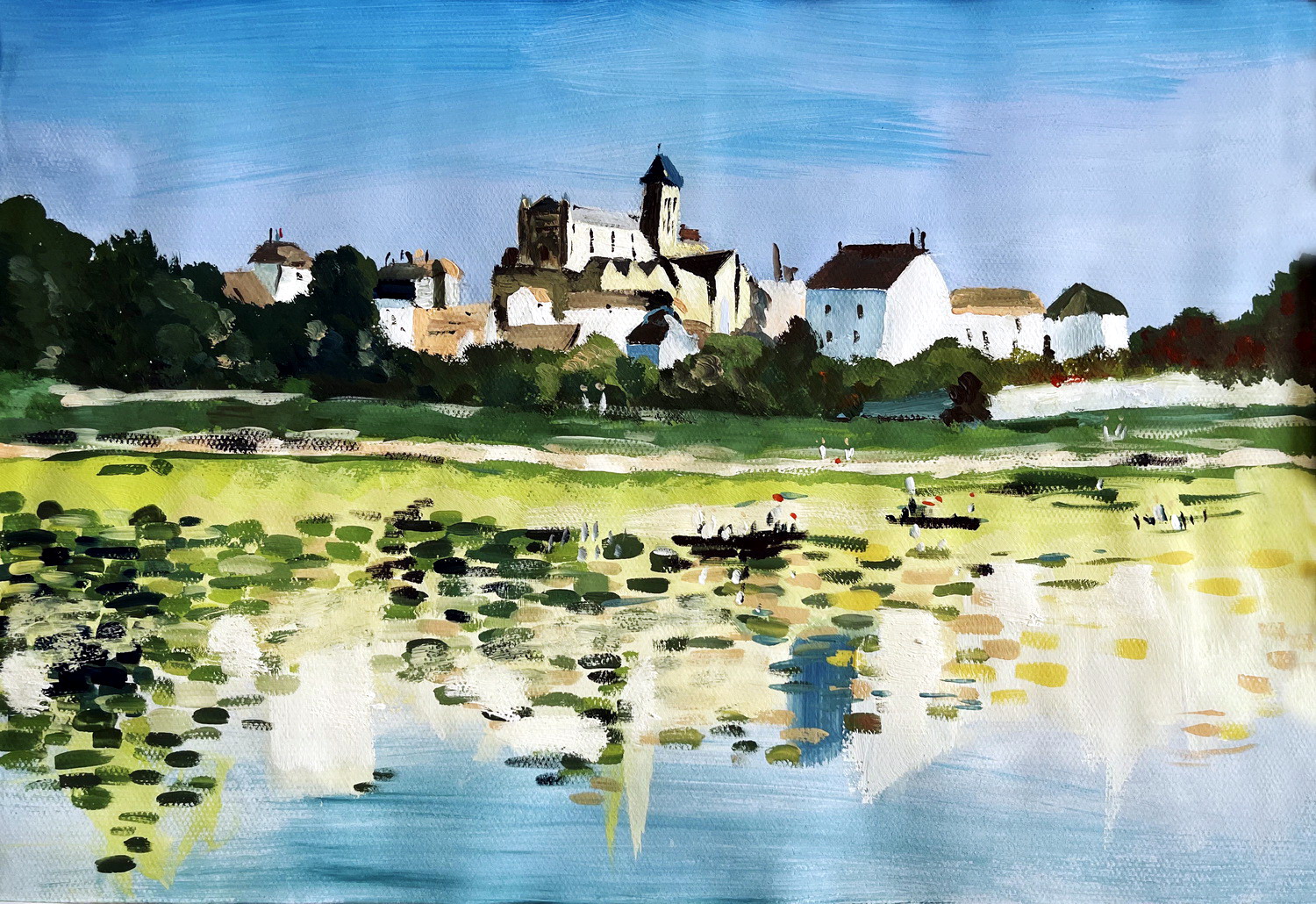 从技法层面看,作品以厚涂与笔触感鲜明的笔触构建画面,前景水面的睡莲以概括的块状色彩堆叠,既还原了植物的形态特征,又保留了绘画语言的生动性;中景的草地与远景的建筑群则通过色彩层次区分空间 —— 前景的黄绿调明亮饱和,中景的青绿略作灰调处理,远景的建筑以白、浅褐为主,搭配深绿的植被形成块面对比,虽未使用严格的透视法则,但通过色彩明度与色块大小的递进,自然营造出近、中、远三层空间关系,体现了创作者对画面秩序的初步把控。