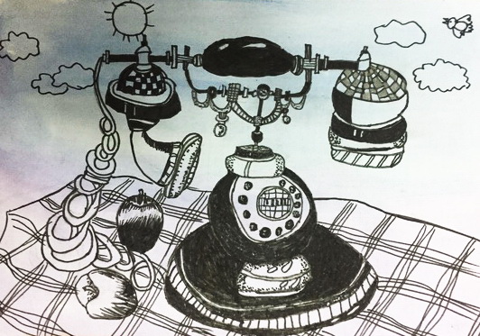 这幅《电话写生》展现了小作者出色的造型能力与艺术创造力,在少儿美术作品中尤为亮眼。画面以超现实解构的手法重构电话形态,打破写实框架,将不同年代的电话部件拆解重组,中心主体与悬浮的听筒、拨号盘形成错落有致的视觉层次,既保留了电话的核心识别特征,又通过夸张、拼接的手法赋予作品奇幻的童话感,体现了小作者对物象的敏锐观察与大胆想象。