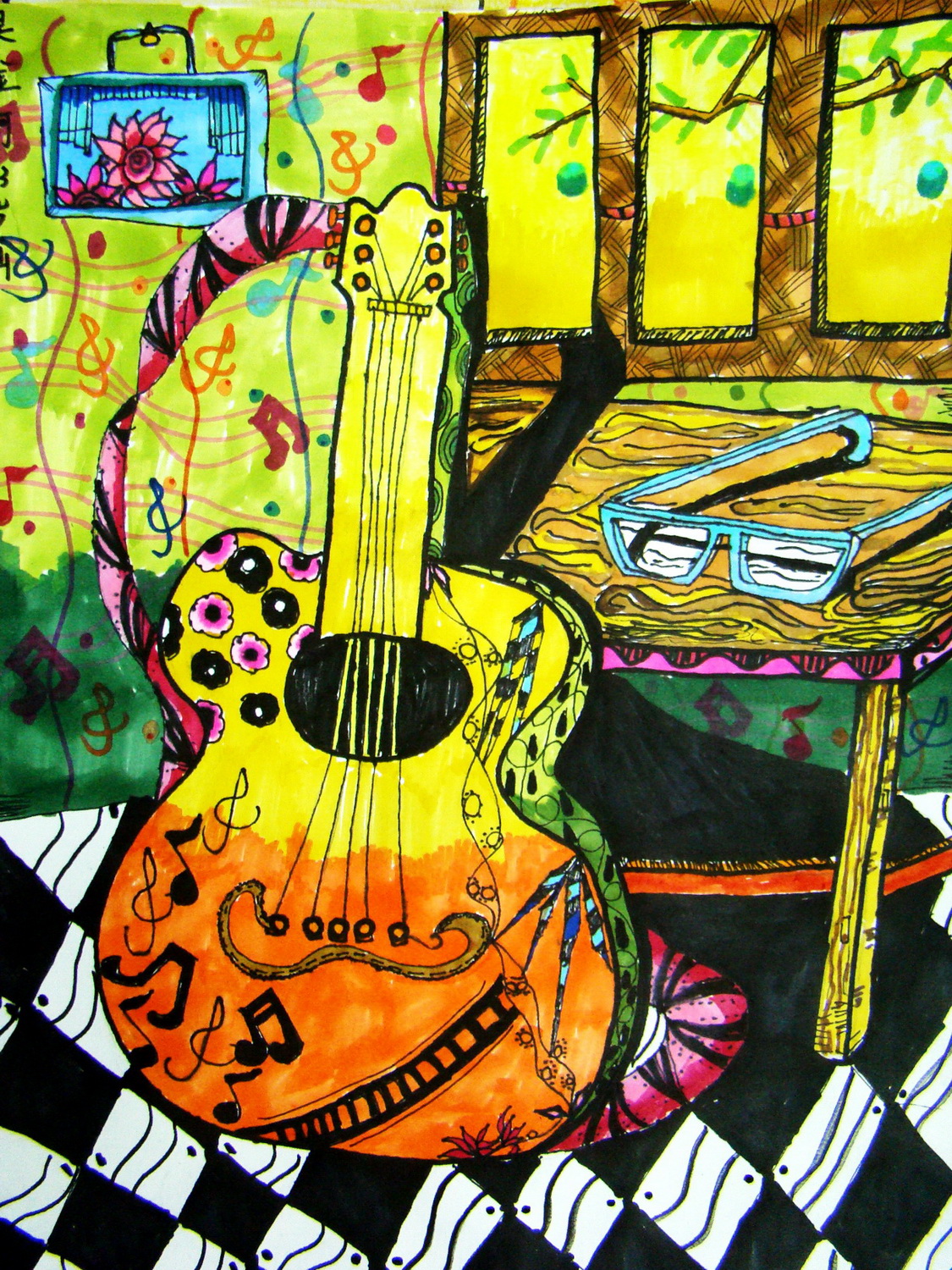 画面构图大胆,采用俯视视角突出中心主体,黑白地板如钢琴键般呼应音乐主题;色彩明快丰富,线条流畅自信,细节处如镜中倒影、墙饰莲花等,既富童趣又见巧思,体现出扎实的绘画基础与独特的审美表达。