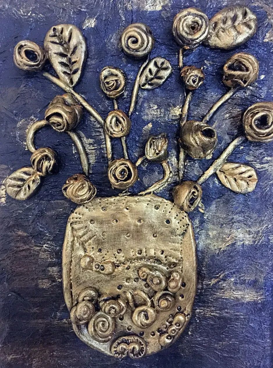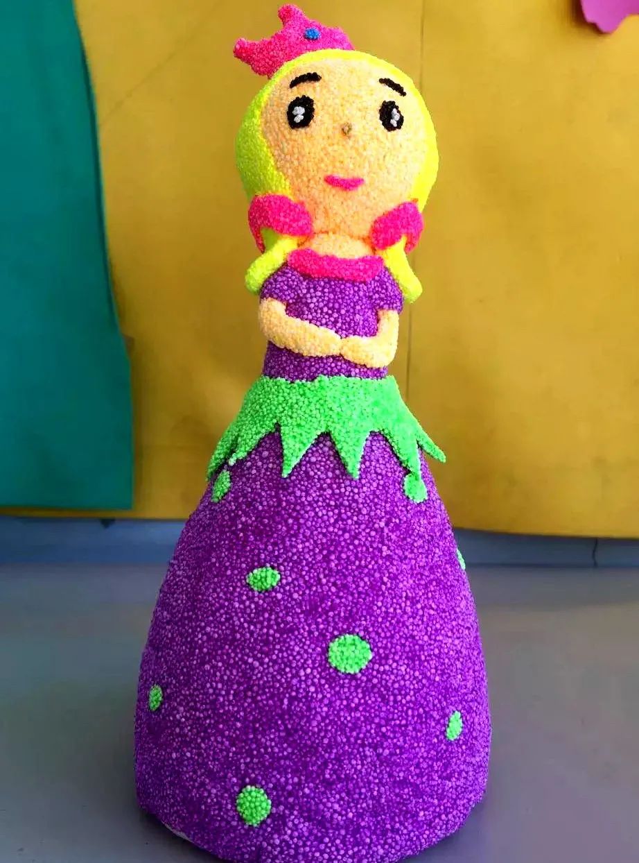 这是一幅特殊材料的雕塑作品,对于人物的设计小作者很有自己的主见,黄与紫的搭配显示出了人物身份的高贵。